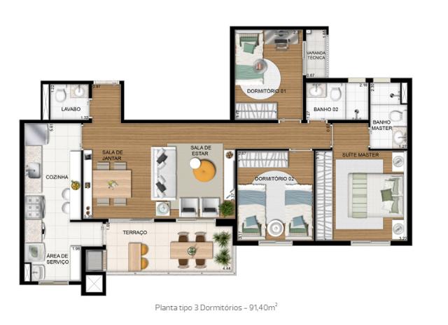 Torre Auri com apartamentos de 91,40 M² 3 dormitórios sendo 1 suíte + lavabo e terraço gourmet com churrasqueira a carvão.